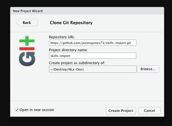 At the third prompt, paste in the GitHub repository link that you copied earlier. The Project directory name should populate automatically, but if not, use the same name as the GitHub repository (skills-import). You can accept the default location for where the Project directory will be created on your computer or you can use the Browse button to choose where you would like for the project directory to be created.