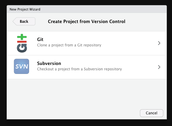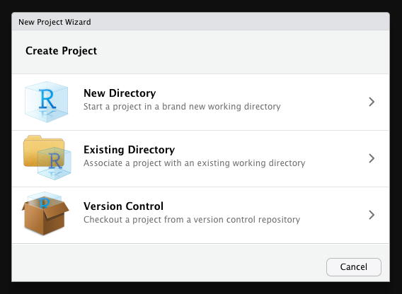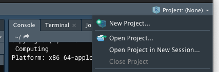 After copying the link, go to RStudio Desktop and use the menu located at the top right of the IDE to create a new project.
